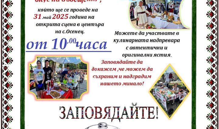 НЧ ”Съгласие 1891” – с. Осенец за четвърта година организира Кулинарен фестивал ”Аромат от миналото, вкус на бъдещето” на 31.05.2025 г., събота, на Открита сцена в Центъра на с. Осенец, община Разград.