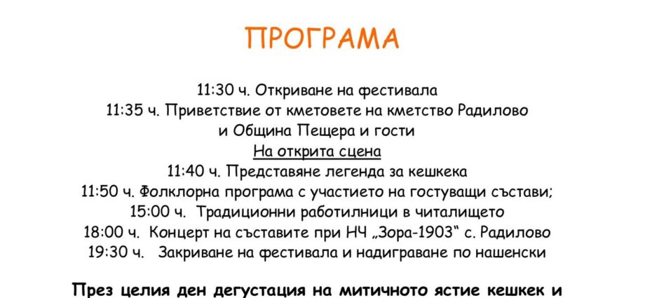 Национален фестивал на кешкека и народните умения Радилово 2024 ще се проведе на 22 септември 2024 г. в с. Радилово, община Пещера.